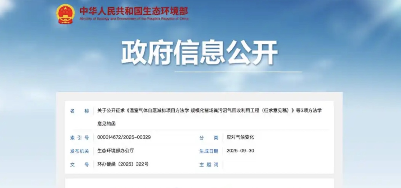 生态环境部于9月30日发布第四批温室气体自愿减排项目(CCER)方法学的征求意见稿——《规模化猪场粪污沼气回收利用工程》,为规模化猪场通过沼气工程实现温室气体减排提供了明确的技术规范与核算依据。