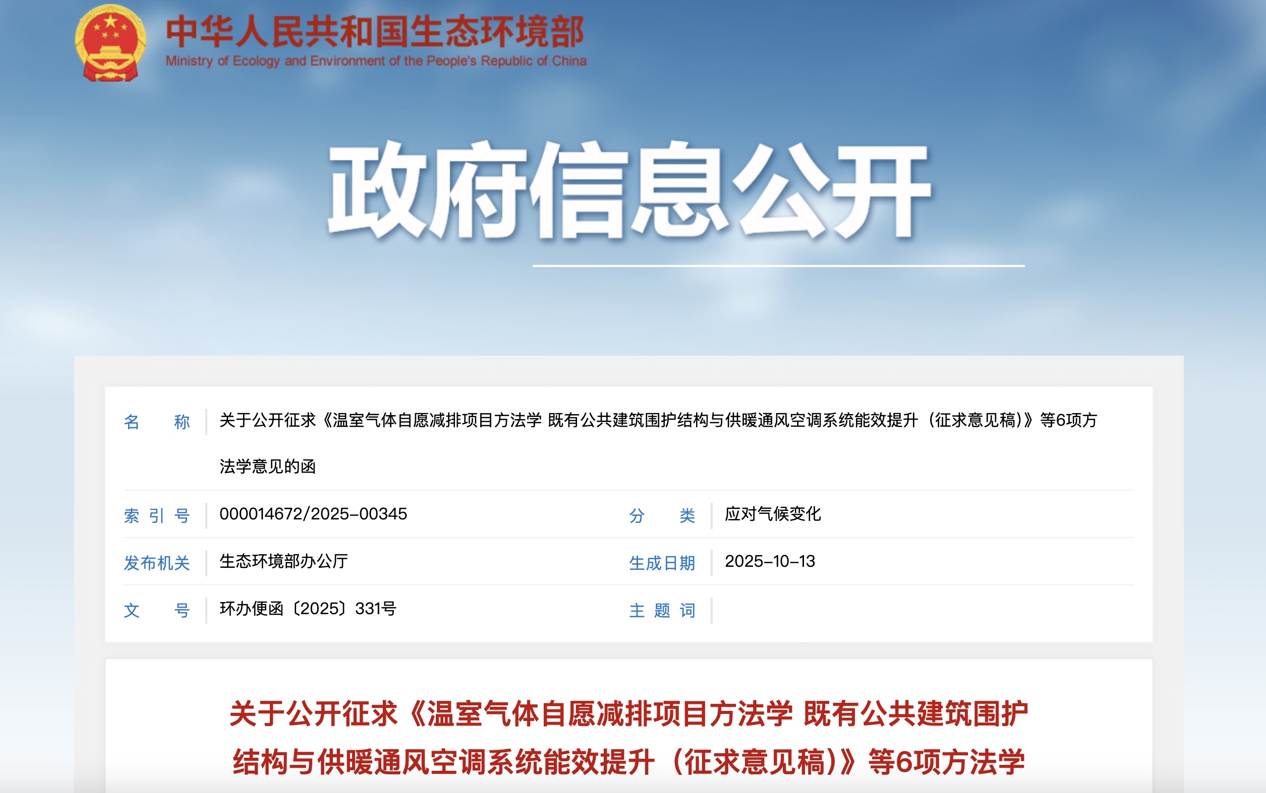 关于公开征求《温室气体自愿减排项目方法学 既有公共建筑围护结构与供暖通风空调系统能效提升(征求意见稿)》等6项方法学意见的函
